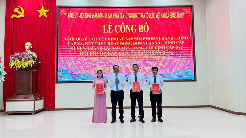 Sáng ngày 30-6-2025, Huyện ủy, HĐND, UBND, UBMTTQ Việt Nam huyện Giang Thành long trọng tổ chức Lễ công bố các nghị quyết, quyết định của Trung ương về sáp nhập đơn vị hành chính cấp xã, kết thúc hoạt động đơn vị hành chính cấp huyện, thành lập tổ chức đảng, chỉ định cấp ủy, Hội đồng nhân dân, ủy ban nhân dân, ủy ban mặt trận tổ quốc Việt Nam xã Giang Thành, tỉnh An Giang năm 2025. Dự Lễ công bố có đồng chí Phạm Văn Đằng- Phó chủ tịch thường trực LĐLĐ tỉnh; đ/c Tạ Minh Danh – Nguyên Bí thư Huyện ủy; đ/c Ong Văn Ngay- Nguyên Bí thư Huyện ủy, Nguyên Phó trưởng ban tổ chức Tỉnh ủy; đ/c Lâm Dũ Trung – Nguyên Phó Bí thư Thường trực Huyện ủy; đ/c Nguyễn Thị Liễu – Phó Chủ tịch HĐND huyện.