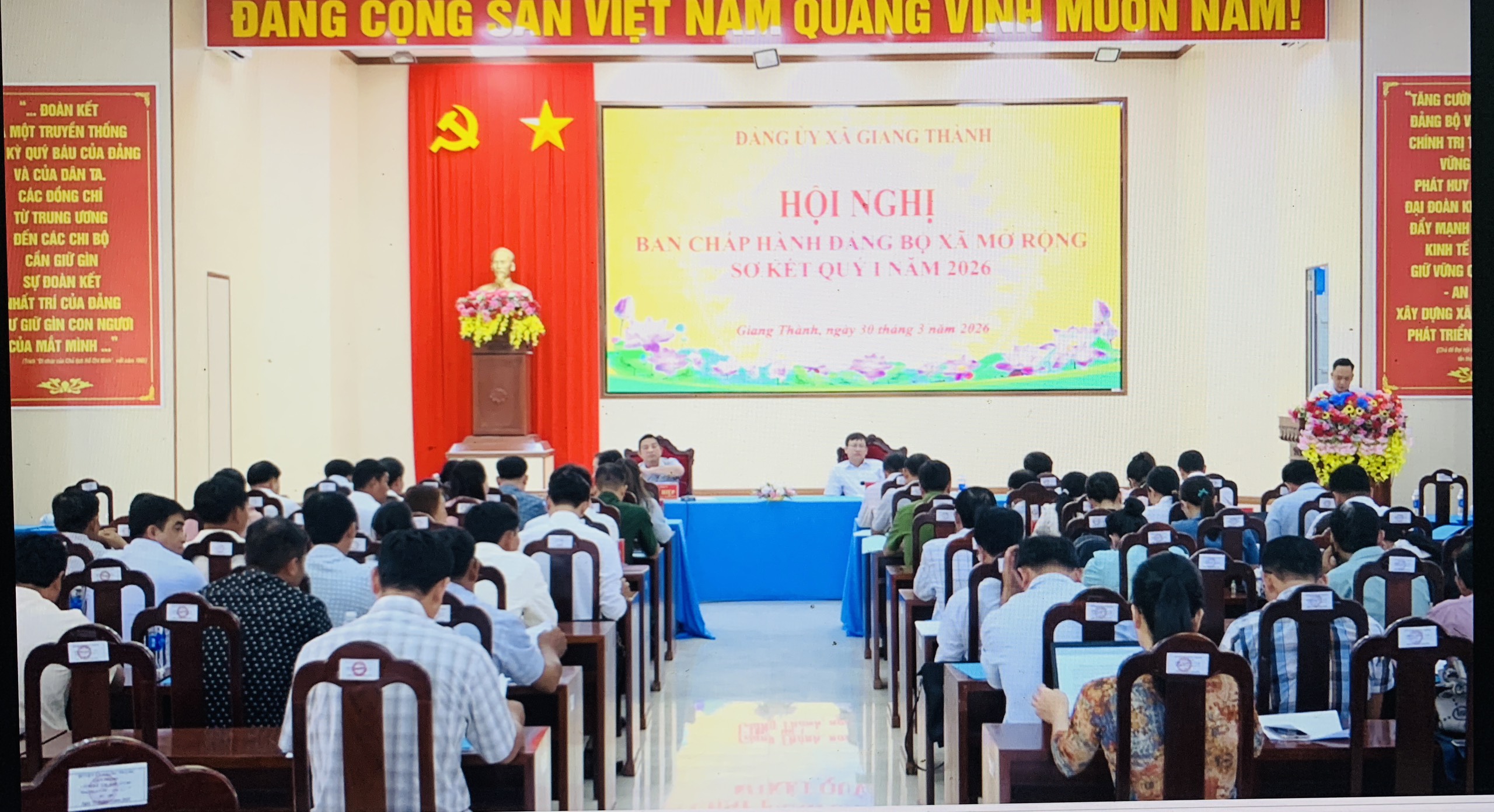 Chiều 30/3/2026, Đảng ủy xã Giang Thành tổ chức Hội nghị Ban Chấp hành Đảng bộ xã mở rộng nhằm sơ kết tình hình thực hiện nhiệm vụ chính trị, kinh tế - xã hội, quốc phòng - an ninh trong quý I, đồng thời đề ra phương hướng, nhiệm vụ trọng tâm trong quý II năm 2026. Tham dự hội nghị có đồng chí Võ Văn Bình – Phó bí thư Thường trực Đảng ủy, Chủ tịch HĐND xã; đồng chí Tạ Hiệp - Phó Bí thư Đảng ủy, Chủ tịch UBND xã, cùng các đồng chí trong Ban Chấp hành Đảng bộ xã, lãnh đạo HĐND, UBND, Ủy ban MTTQ Việt Nam xã, trưởng các ban ngành, đoàn thể cùng bí thư các chi bộ trực thuộc.