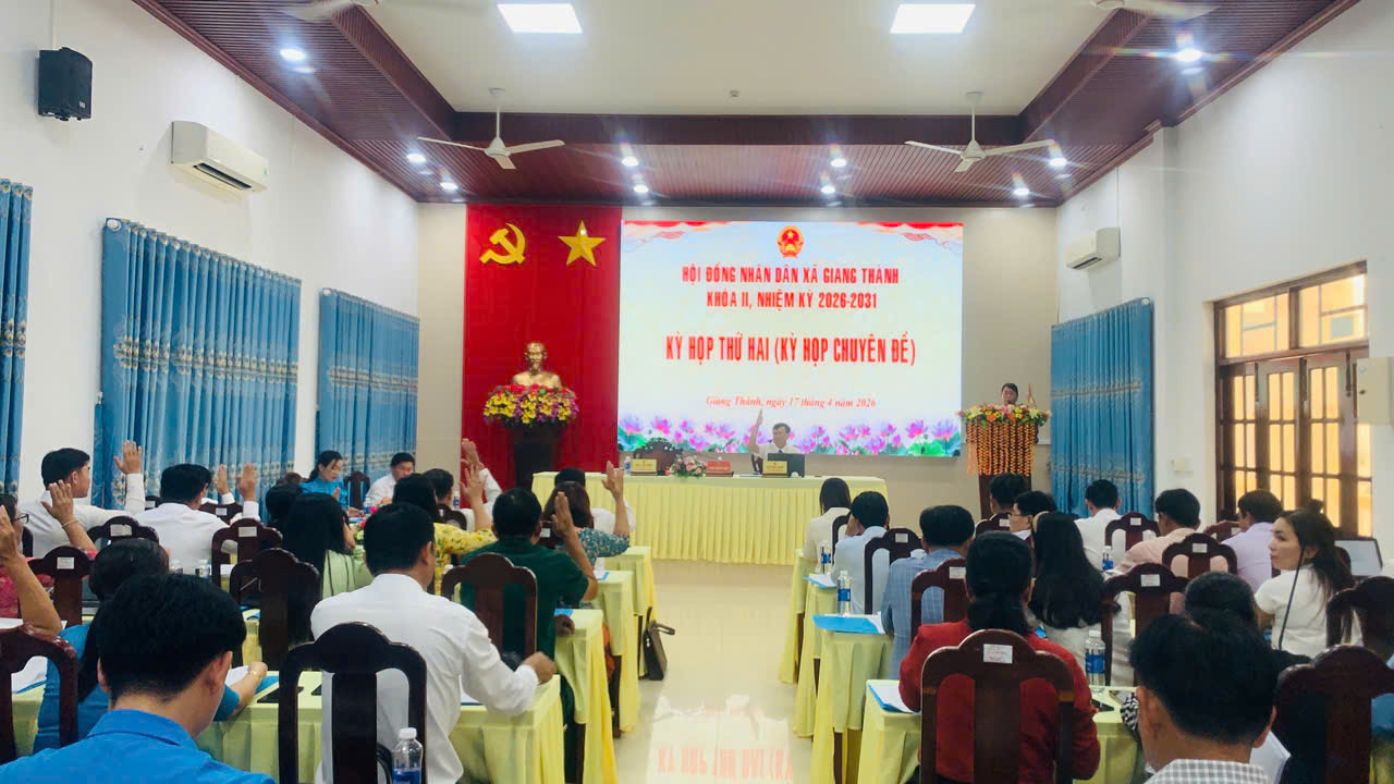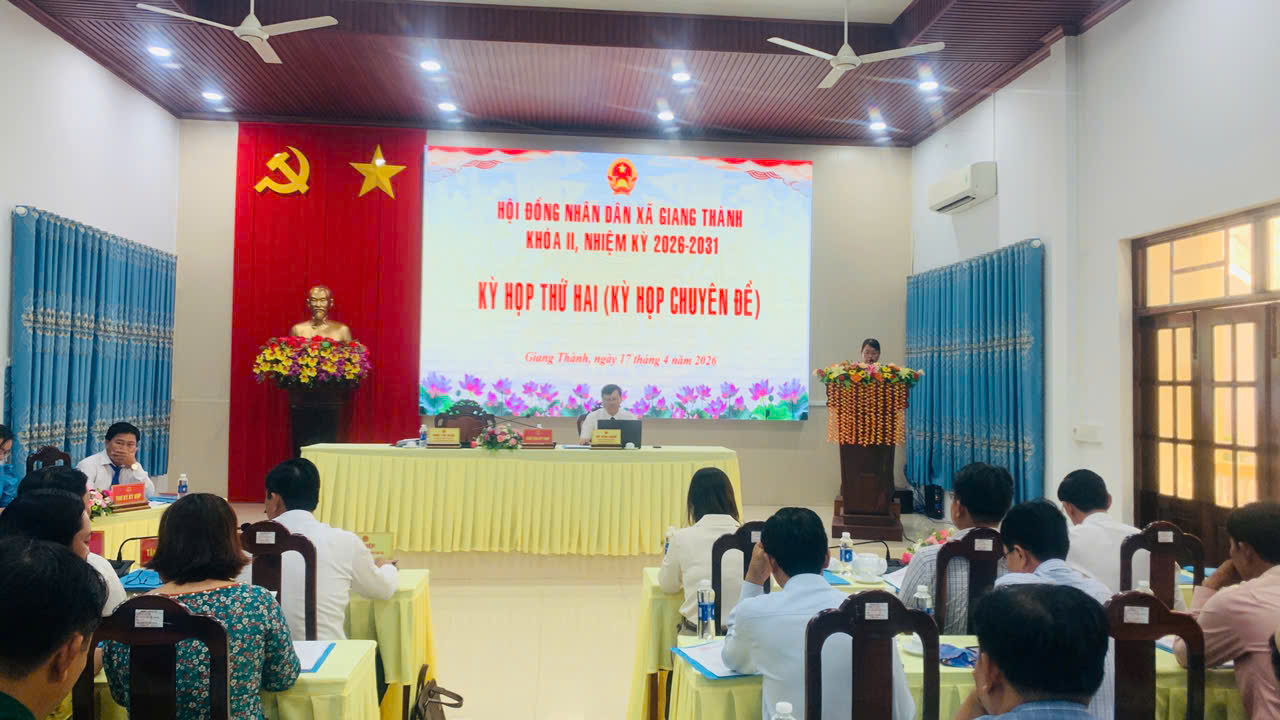 Sáng ngày 17/4, Hội đồng nhân dân xã Giang Thành khóa II, nhiệm kỳ 2026 – 2031 long trọng tổ chức Kỳ họp thứ hai, Kỳ họp chuyên đề nhằm xem xét thảo luận và quyết nghị một số nội dung quan trọng cấp bách thuộc thẩm quyền của HĐND xã. Dự kỳ họp có đồng chí Võ Văn Bình - Phó Bí thư thường trực Đảng ủy, Chủ tịch HĐND xã; đồng chí Tạ Hiệp - Phó Bí thư Đảng ủy, Chủ tịch UBND xã; đồng chí Ngô Thị Mận – UV. BTV Phó Chủ tịch HĐND xã; đồng chí Tăng Văn Bước - UV. BTV Chủ tịch UBMTTQ Việt Nam xã; cùng các vị đại biểu HĐND xã khóa II, nhiệm kỳ 2026 – 2031.