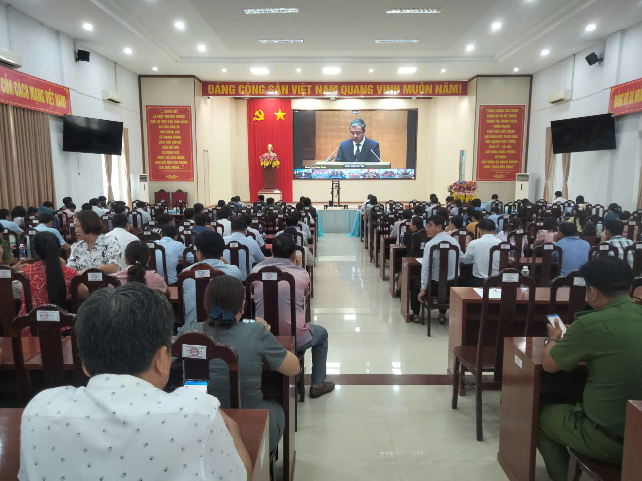 Sáng ngày 25/02/2026, tại Hội trường Đảng ủy, Ban thường vụ Đảng ủy xã Giang Thành tổ chức điểm cầu tham dự Hội nghị trực tuyến toàn quốc nghiên cứu, quán triệt, triển khai thực hiện Nghị quyết số 79 và Nghị quyết số 80 của Bộ Chính trị. Tham dự tại điểm cầu xã Giang Thành có các đồng chí Hà Văn Thanh Khương - Bí thư Đảng ủy; đồng chí Võ Văn Bình - Phó Bí thư Đảng ủy, Chủ tịch HĐND xã; đồng chí Tạ Hiệp - Phó Bí thư Đảng ủy, Chủ tịch UBND xã, cùng với 140 đại biểu là các đồng chí trong Ban thường vụ, Ban chấp hành Đảng bộ xã; lãnh đạo các ban ngành, đoàn thể xã; Bí thư các Chi đảng bộ trực thuộc; cán bộ, công chức, viên chức, hiệu trưởng, hiệu phó các trường trên địa bàn.