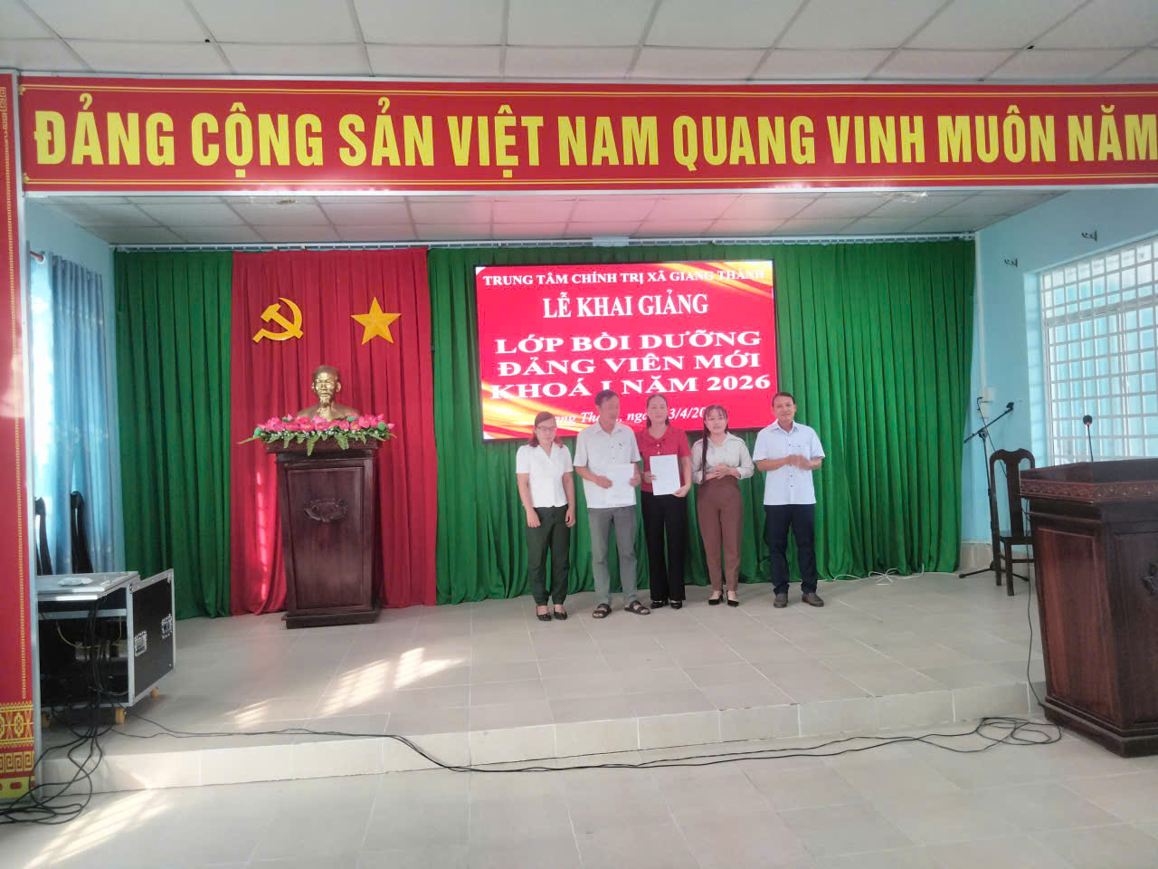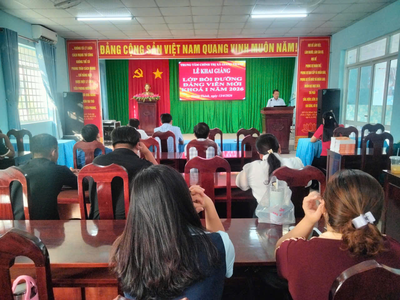 Sáng 13/4, Trung tâm Chính trị xã Giang Thành (tỉnh An Giang) tổ chức lễ khai giảng lớp bồi dưỡng lý luận chính trị dành cho đảng viên mới đợt 1/2026. Tham dự lớp bồi dưỡng lý luận chính trị dành cho đảng viên mới đợt 1/2026 có 29 đảng viên đang công tác tại các Đảng bộ, chi bộ trực thuộc Đảng ủy các xã Giang Thành và xã Vĩnh Điều.