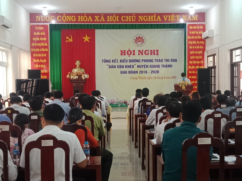 Sáng ngày 12/8, Huyện ủy Giang Thành tổ chức hội nghị tổng kết, biểu dương phong trào thi đua “Dân vận khéo” huyện giai đoạn 2016 - 2020. Đến dự có đ/c Tạ Văn Dũng - Phó Bí thư Thường trực Huyện ủy; đ/c Lâm Dũ Trung - Phó Bí thư Huyện ủy; đ/c Nguyễn Thị Liễu - UVBTV, Phó Chủ tịch HĐND huyện; đ/c Huỳnh Trọng Đức - HUV, Phó Chủ tịch UBND huyện.
