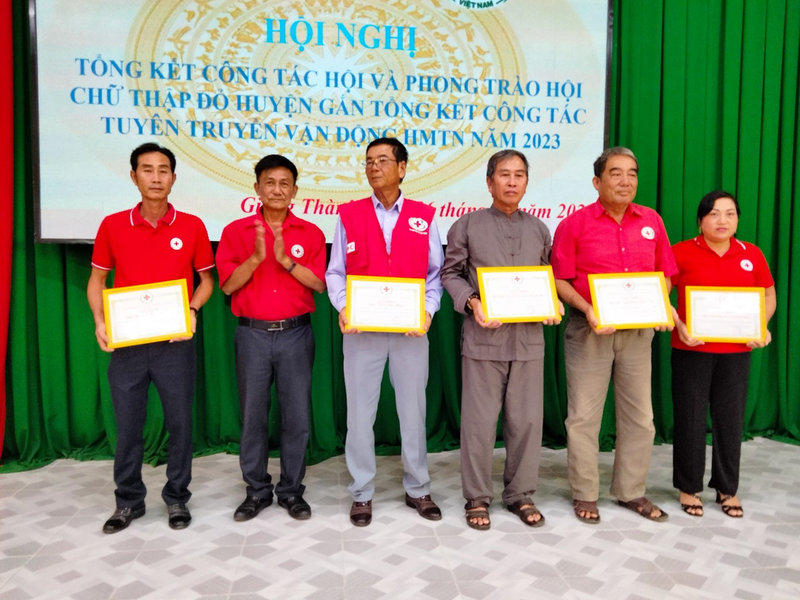 Dịp này, UBND huyện Giang Thành đã tặng giấy khen cho 03 tập thể, 04 cá nhân đã có thành tích xuất sắc trong công tác vận động hiến máu tình nguyện năm 2023. Hội chữ thập đỏ huyện tặng giấy khen cho 03 tập thể, 04 cá nhân hoàn thành xuất sắc nhiệm vụ Hội và phong trào chữ thập đỏ năm 2023./.