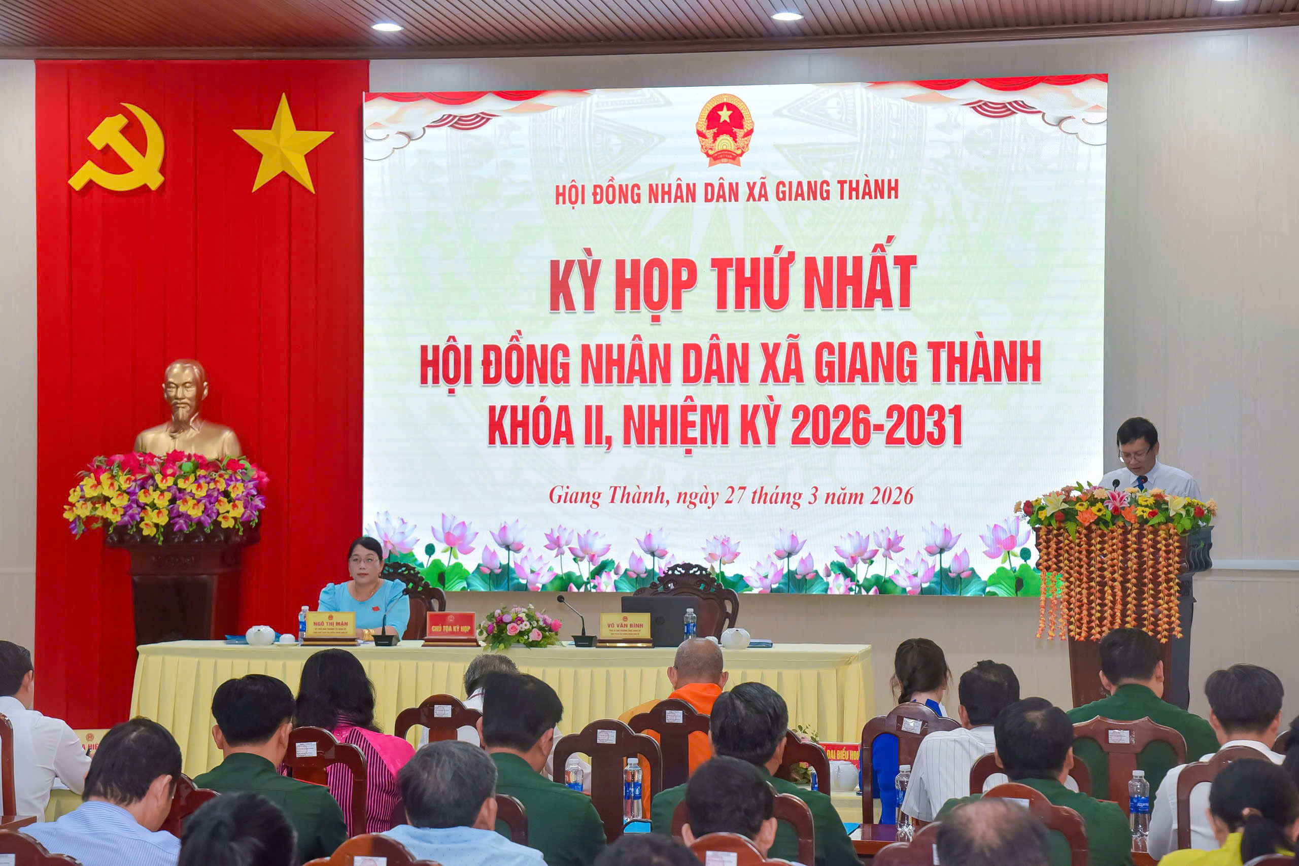 Chiều 27/3, HĐND xã Giang Thành khóa II, nhiệm kỳ 2026 - 2031 tổ chức Kỳ họp thứ Nhất bầu các chức danh chủ chốt của HĐND và UBND nhiệm kỳ 2026 - 2031. Đến dự có ông Hà Văn Thanh Khương – Bí thư Đảng ủy xã Giang Thành, ông Võ Văn Bình – Phó bí thư Thường trực Đảng ủy, Chủ tịch HĐND xã khóa I; ông Tạ Hiệp – Phó bí thư Đảng ủy, Chủ tịch UBND xã, nhiệm kỳ 2021-2026.