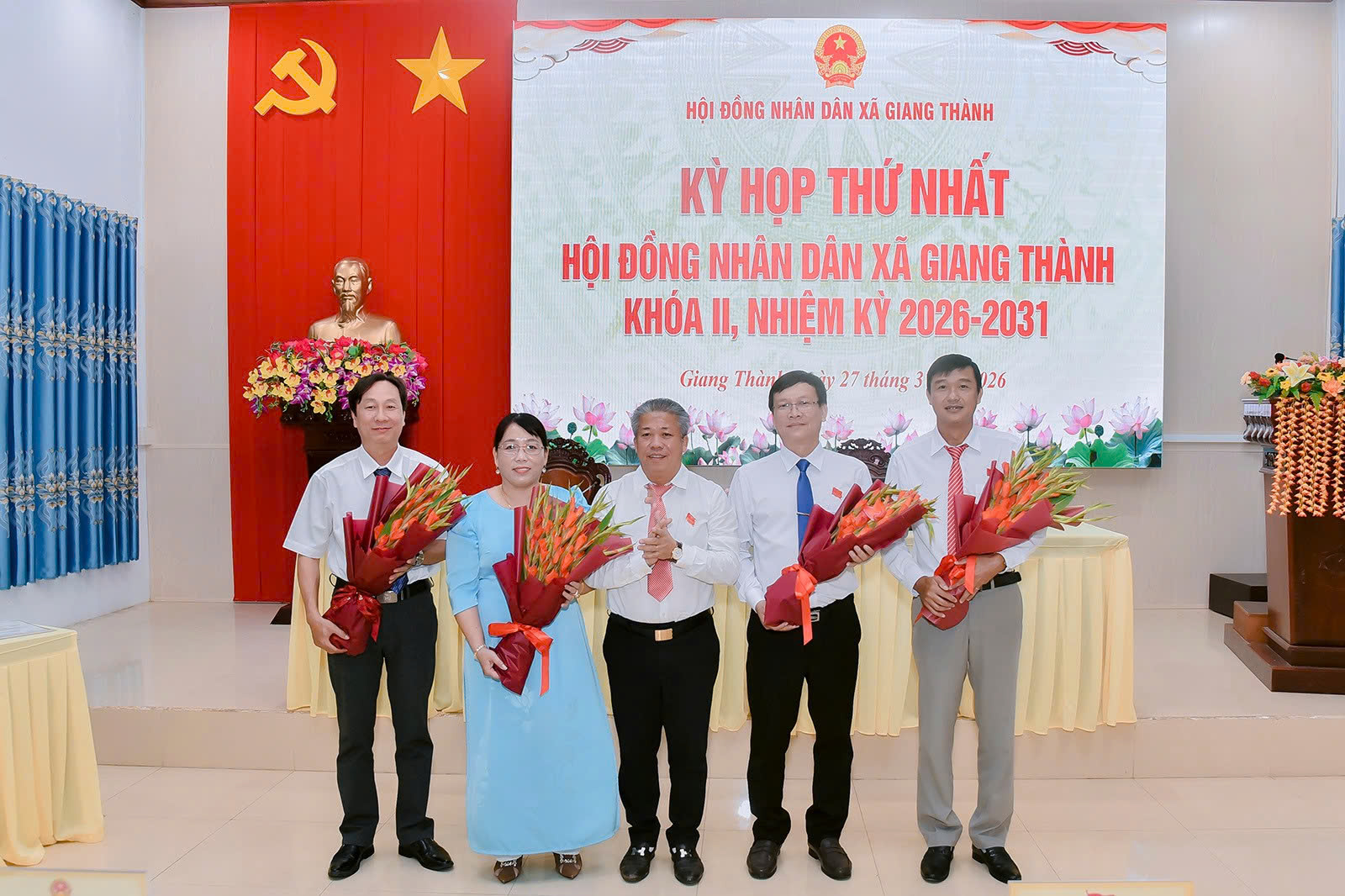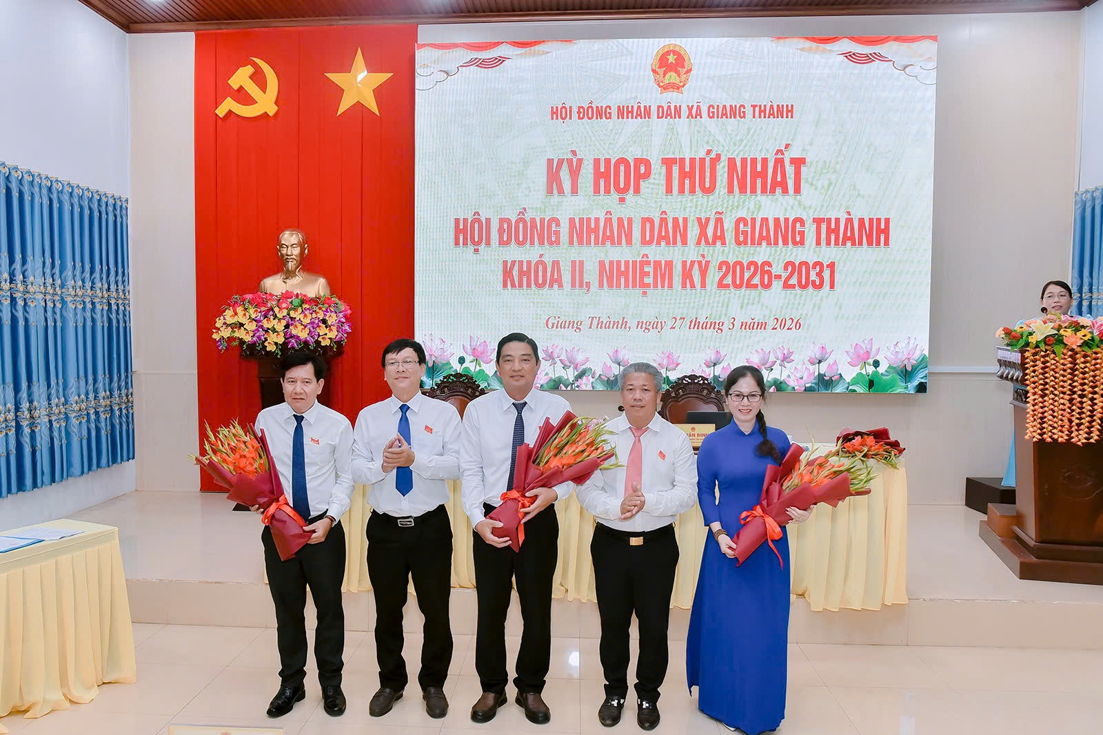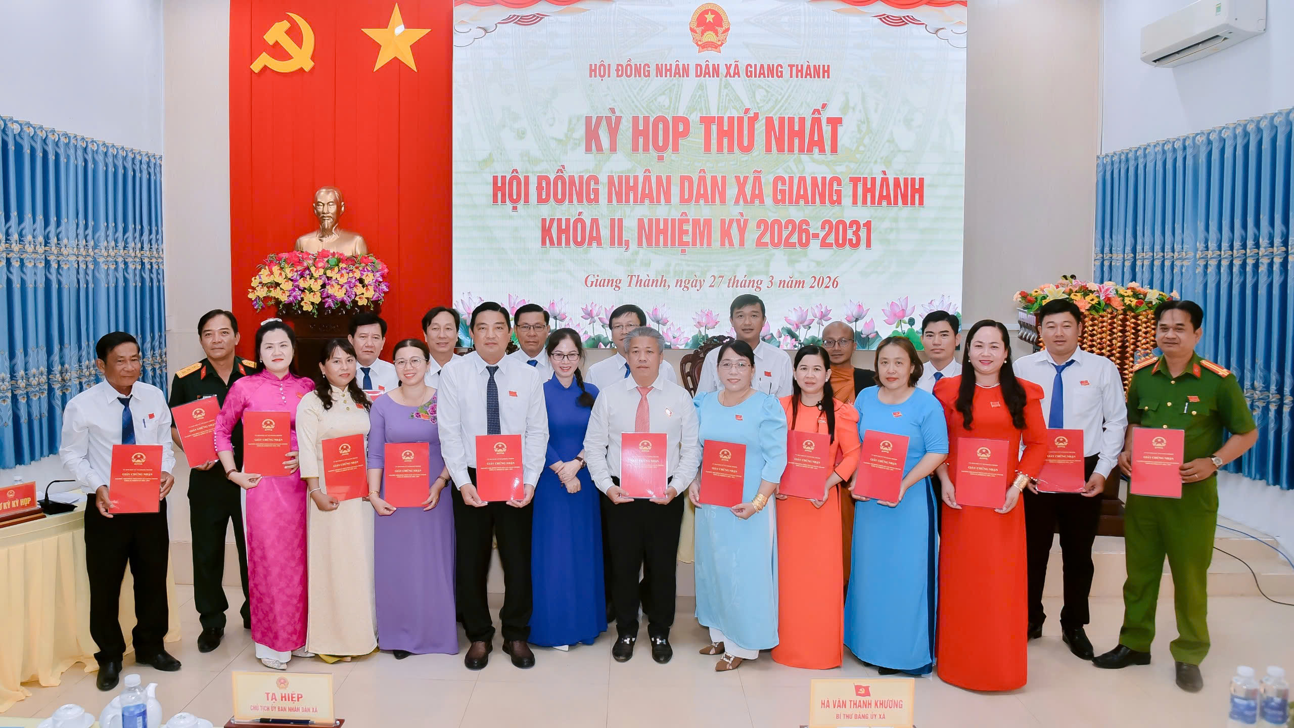 Ông Tạ Hiệp, Phó Bí thư Đảng ủy, Chủ tịch UBND xã được bầu giữ chức Chủ tịch UBND xã Giang Thành, nhiệm kỳ 2026 - 2031; ông Danh Minh Hùng - Đảng ủy viên, Phó Chủ tịch UBND xã và bà Trần Ngọc Bích – Đảng ủy viên, Phó Chủ tịch UBND xã được bầu giữ chức Phó Chủ tịch UBND xã, nhiệm kỳ 2026 - 2031.