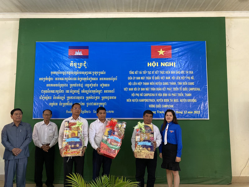 Sáng ngày 26/12/2022, tại huyện Kampongtrach, tỉnh Kampot, vương quốc Campuchia, Hội liên hiệp Thanh niên Việt Nam huyện Giang Thành phối hợp cùng Ủy ban MTTQ Việt Nam và Hội LHPN Việt Nam huyện Giang Thành tham dự hội nghị tổng kết giai đoạn (2019 - 2022) và tiếp tục ký kết thực hiện bản giao ước thi đua giữa Ủy ban Mặt trận Tổ quốc Việt Nam, Hội liên hiệp Phụ nữ Việt Nam, Hội liên hiệp Thanh niên Việt Nam huyện Giang Thành với Ủy ban Mặt trận đoàn kết phát triển Tổ quốc Campuchia, Hội Phụ nữ Campuchia vì hòa bình và phát triển; Phòng Giáo dục và Thanh niên các huyện Kampongtrach, Boon Tia Mies và huyện Kirivong vương quốc Campuchia giai đoạn 2022 - 2027.