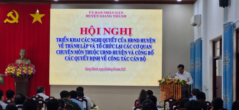 Tại Hội nghị, huyện Giang Thành đã công bố Nghị quyết về việc sắp xếp, tổ chức lại các cơ quan chuyên môn thuộc UBND huyện và công tác cán bộ. Cụ thể, thành lập Phòng Nông nghiệp và Môi trường trên cơ sở hợp nhất Phòng Nông nghiệp và Phát triển nông thôn huyện và Phòng Tài nguyên và Môi trường huyện; thành lập Phòng Văn hóa, Khoa học và Thông tin; thành lập Phòng Kinh tế, Hạ tầng và Đô thị; thành lập Phòng Y tế; tổ chức lại Phòng Nội vụ trên cơ sở hợp nhất Phòng Lao động - Thương binh và Xã hội và Phòng Nội vụ; tổ chức lại Phòng Tài chính trên cơ sở đổi tên Phòng Tài chính - Kế hoạch thành Phòng Tài chính.