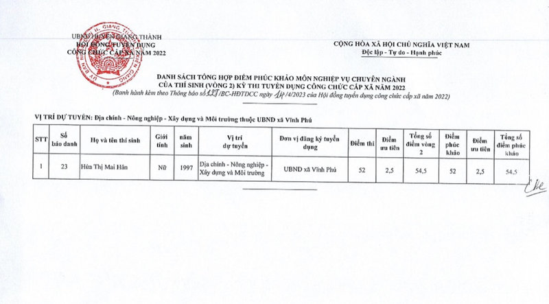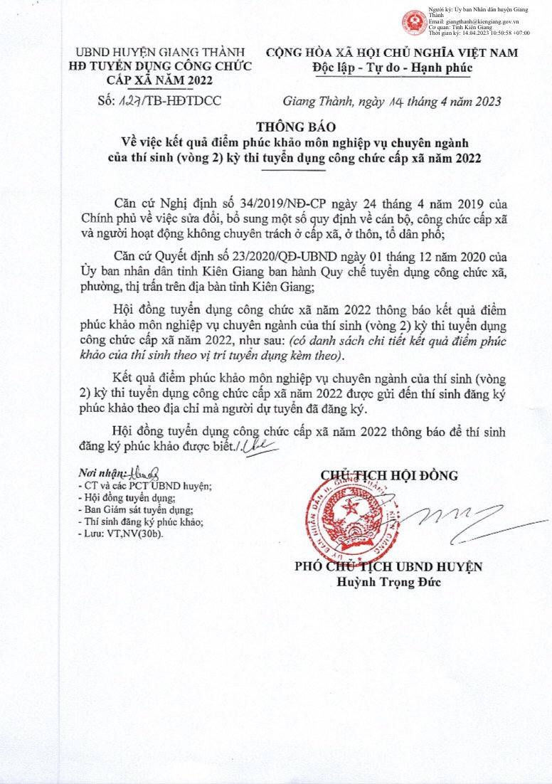 aA Xây dựng chính quyền Thông báo kết quả phúc khảo kỳ thi tuyển công chức cấp xã 14/04/2023, 13:41 Tập tin đính kèm:127.TB-UBND_0001.signed.pdf Quay về Chia sẻ Z Copy link thành công Tin khác HỘI NGHỊ TỔNG KẾT BẢO VỆ NỀN TẢNG TƯ TƯỞNG CỦA ĐẢNG, ĐẤU TRANH PHẢN BÁC CÁC QUAN ĐIỂM SAI TRÁI, THÙ ĐỊCH (BAN CÔNG TÁC 35 ĐẢNG UỶ) NĂM 2025 GẮN VỚI HỘI NGHỊ GIAO BAN ANTT QUÝ IV/2025 Xây dựng chính quyền 29/12/2025 Trung tâm Y tế huyện Giang Thành tăng cường vai trò "Người gác cổng" của Trạm Y tế các xã Xây dựng chính quyền 15/07/2024 Ủy ban Mặt trận Tổ quốc Việt Nam huyện Giang Thành Đại hội đại biểu lần thứ IV, nhiệm kỳ 2024 - 2029 Xây dựng chính quyền 28/06/2024 UBND huyện Giang Thành triển khai quyết định về công tác tổ chức cán bộ Xây dựng chính quyền 28/06/2024 Đại biểu HĐND 03 cấp tiếp xúc cử tri trước kỳ họp thường lệ giữa năm tại UBND xã Phú Lợi huyện Giang Thành Xây dựng chính quyền 14/06/2024 GIANG THÀNH KHAI GIẢNG LỚP SƠ CẤP LÝ LUẬN CHÍNH TRỊ KHÓA XV NĂM 2024 Xây dựng chính quyền 05/06/2024 Ban Thường Vụ Huyện ủy làm việc với Ban Thường Trực Ủy ban Mặt Trận Tổ quốc Việt Nam huyện về công tác chuẩn bị Đại hội đại biểu Mặt Trận Tổ quốc Việt Nam huyện nhiệm kỳ 2024-2029 Xây dựng chính quyền 05/06/2024 Giang Thành tổ chức Hội thi Bí thư chi bộ giỏi năm 2024 Xây dựng chính quyền 17/04/2024 Ủy ban Mặt trận Tổ quốc Việt Nam xã Tân Khánh Hòa huyện Giang Thành Đại hội lần thứ XII, nhiệm kỳ 2024 - 2029 Xây dựng chính quyền 13/03/2024 Giang Thành tập huấn, bồi dưỡng kiến thức pháp luật về nghiệp vụ công tác xử lý vi phạm hành chính năm 2024 Xây dựng chính quyền 13/03/2024 /thong-bao-ket-qua-phuc-khao-ky-thi-tuyen-cong-chuc-cap-xa