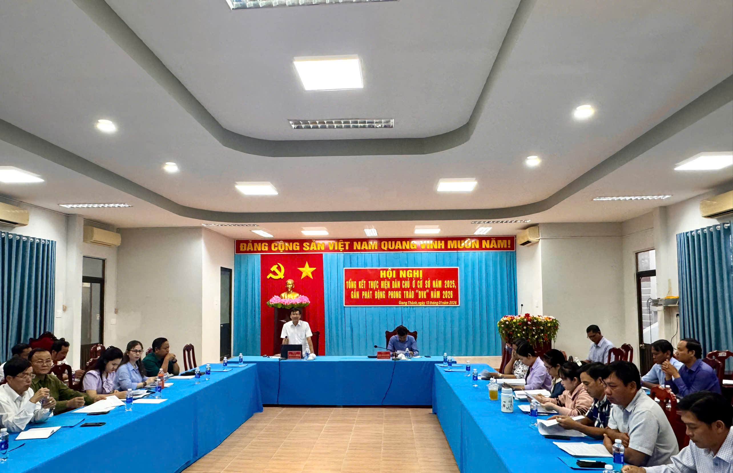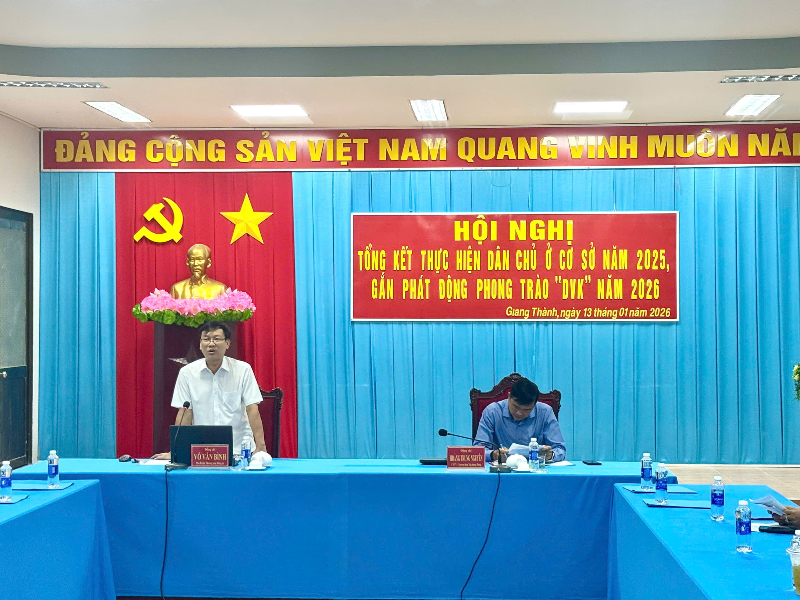 Sáng ngày 13/01/2026, tại Hội Trường nhỏ Đảng ủy xã Giang Thành. Đảng ủy xã Giang Thành tổ chức hội nghị tổng kết thực hiện Quy chế dân chủ ở cơ sở năm 2025 gắn phát động phong trào thi đua “Dân vận khéo” năm 2026. Dự chủ trì hội nghị có Đồng chí Võ Văn Bình, Phó Bí thư Thường trực Đảng ủy kiêm Chủ tịch HĐND xã; Đồng chí Hoàng Trung Nguyên, Ủy viên Ban Thường vụ Đảng ủy xã, Trưởng Ban xây dựng Đảng kiêm Phó Trưởng Ban Thường trực Ban Chỉ đạo và các đồng chí thành viên Ban Chỉ đạo; Lãnh đạo và chuyên viên Ban xây dựng Đảng; đại diện lãnh đạo Văn phòng Đảng ủy; Trưởng, Phó Chủ tịch UBMTTQ Việt Nam xã và các đoàn thể của xã; các đồng chí Bí thư, Phó Bí thư các chi, đảng bộ trực thuộc Đảng ủy xã về dự hội nghị.