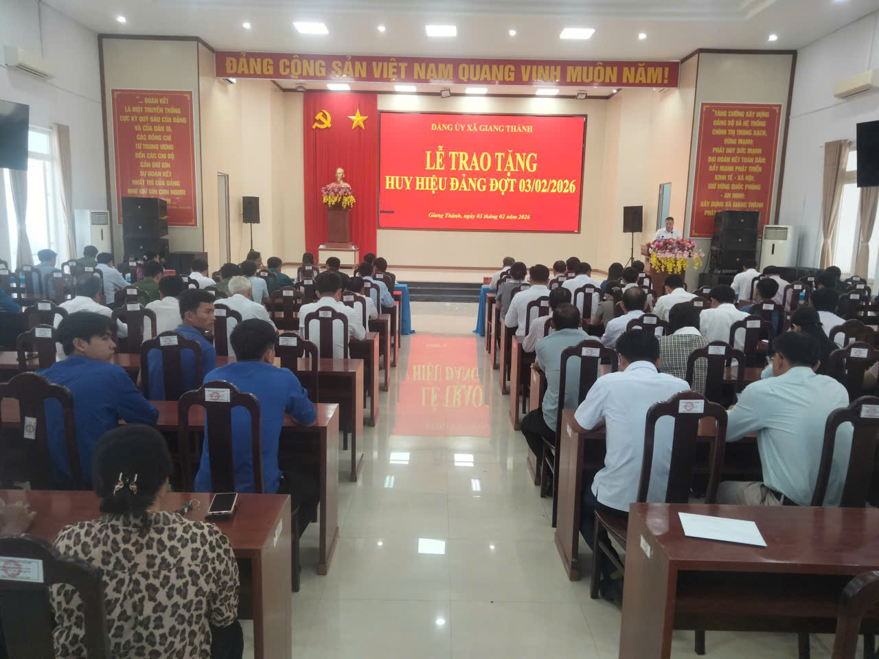Sáng ngày 3/2, Đảng ủy xã Giang Thành tổ chức họp mặt kỷ niệm 96 năm ngày thành lập Đảng cộng sản Việt Nam (3/2/1930 - 3/2/2026) và Lễ trao Huy hiệu Đảng dịp 3 Tháng 2. Đến dự có đ/c Hà Văn Thanh Khương - Bí thư Đảng ủy xã; đ/c Võ Văn Bình – Phó Bí thư Thường trực Đảng ủy, Chủ tịch HĐND xã; đ/c Tạ Hiệp - Phó Bí thư Đảng ủy, Chủ tịch UBND xã.