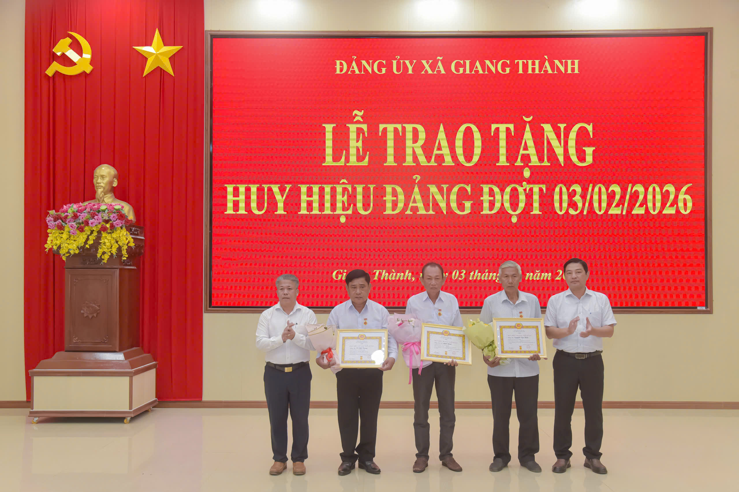 Tại buổi lễ, Ban Thường vụ Đảng ủy xã Giang Thành đã trao huy hiệu 30 năm tuổi Đảng cho các đồng chí: đảng viên Nguyễn Văn Hiểu và Lê Minh Khải, sinh hoạt tại chi bộ ấp Khánh Hòa; đảng viên Tô Việt Trung, sinh hoạt tại chi bộ ấp Thuận Án thuộc Đảng bộ xã Giang Thành. Đây là phần thưởng cao quý của Đảng, ghi nhận quá trình phấn đấu, cống hiến bền bỉ, lâu dài của các đồng chí đối với sự nghiệp cách mạng vẻ vang của Đảng và của dân tộc.